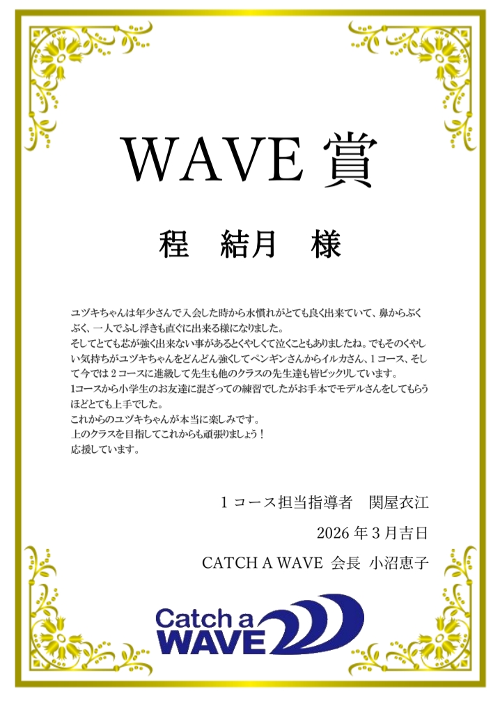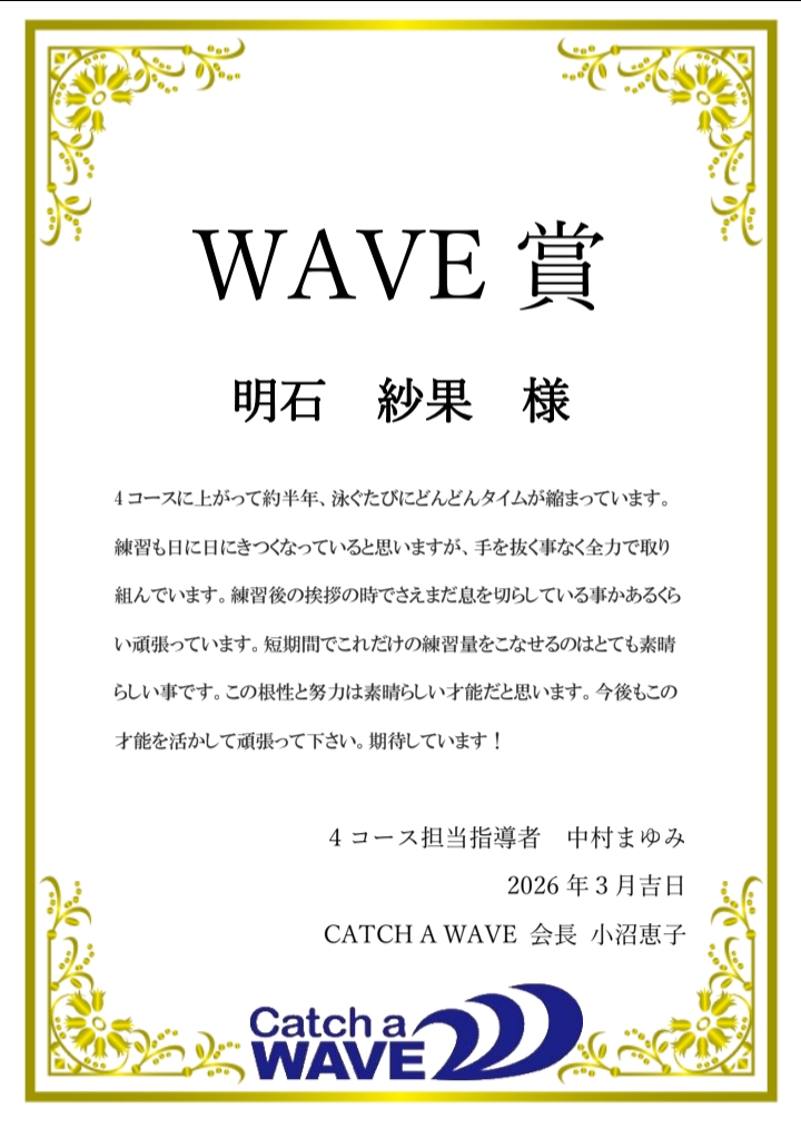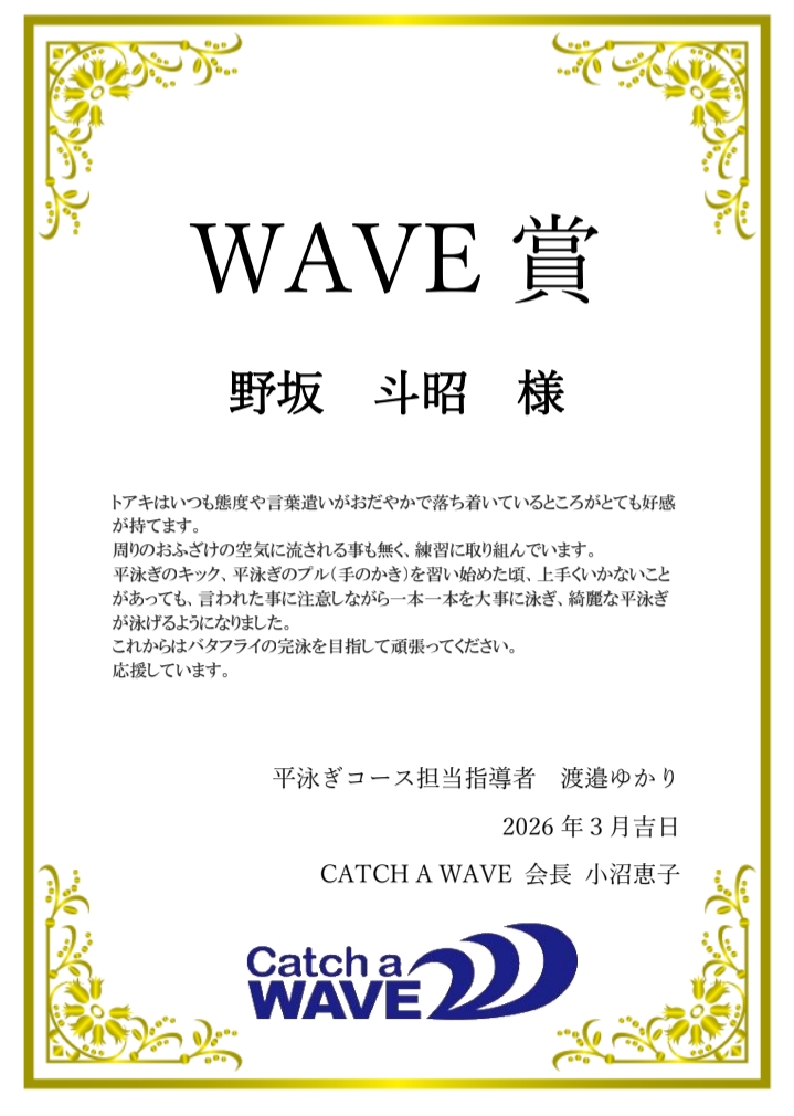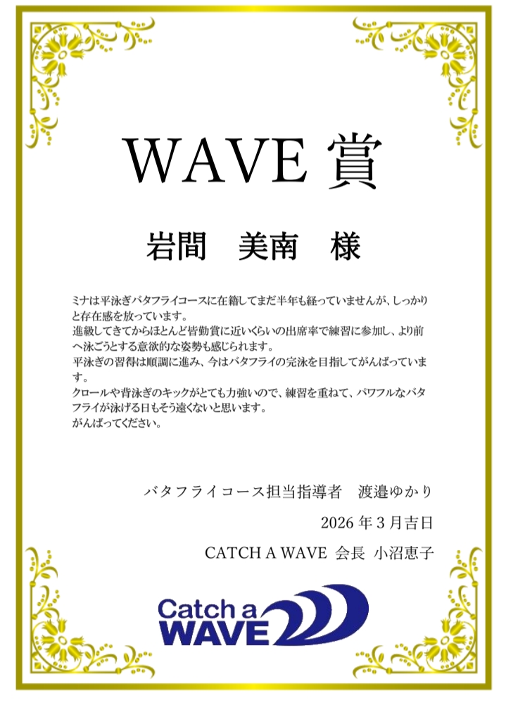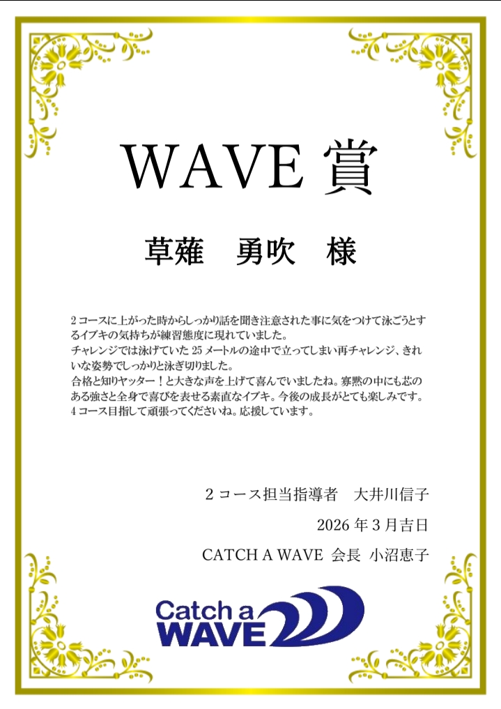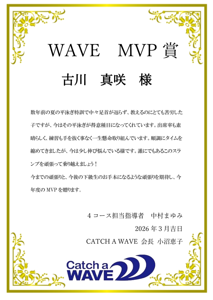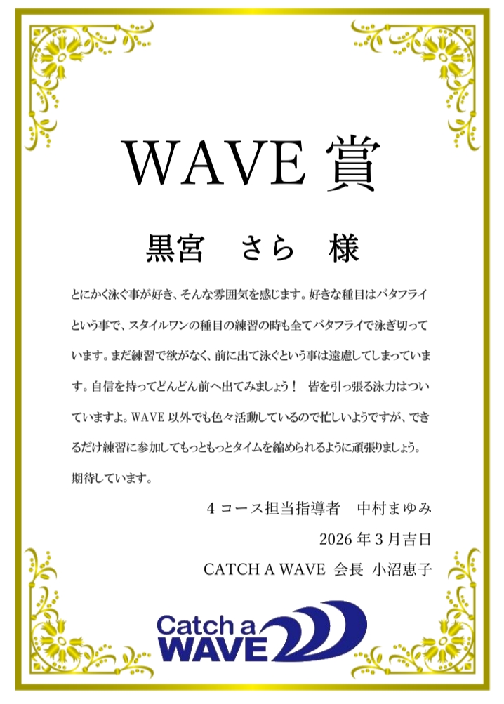 CATCH A WAVEでは、毎年3月に一年間の練習に対して総合的な評価をさせて頂いています。